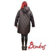 Takissa on huppu, ja siinä mustat kiristysnauhat. Oikealla puolella ylhäällä on pieni rintatasku. Hopeanvärinen vetoketju ei ole ihan helmaan asti. Sivusaumassa on taskut. Helma on hieman pyöristetty. Takin tikkauskuvio muistuttaa peräkkäisiä V-kirjaimia.