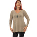 Neuleessa on V-pääntie ja pitkät hihat. Hihansuussa on leveä resorineulos. Pusero on sileää neuletta ja värinä on maanläheinen meleerattu beige. Helma rullaantuu kivasti.