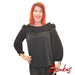 Puserossa on venepääntie ja sitä reunustaa upea röyhelökaitale. Puseroa voi myös käyttää off shouderina. Hihat ovat raglanmalliset ja hihansuissa on kuminauha. Helma on hieman pyöristetty.